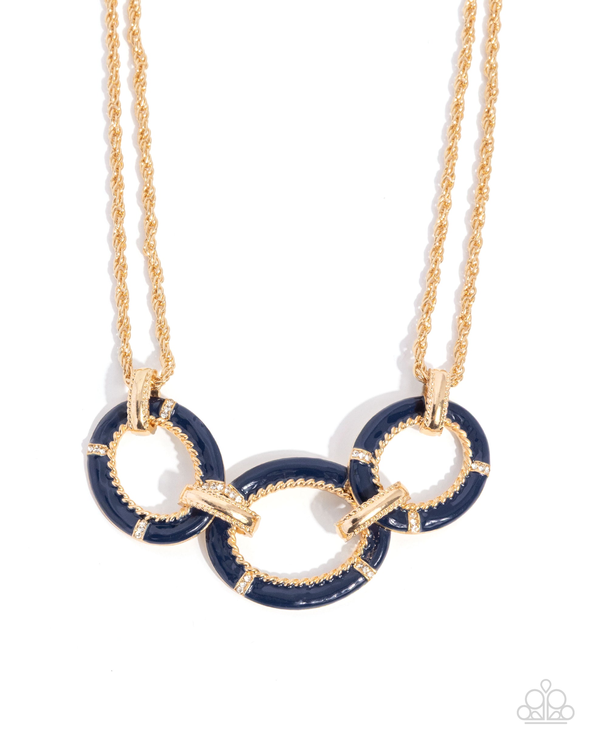A duo of glistening gold rope chains gives way to a trio of navy-painted oval pendants that have been sporadically dusted in trios of dainty white rhinestones. Lace-patterned gold links interconnect each oval for an additional spritz of fine glam. Features an adjustable clasp closure.
